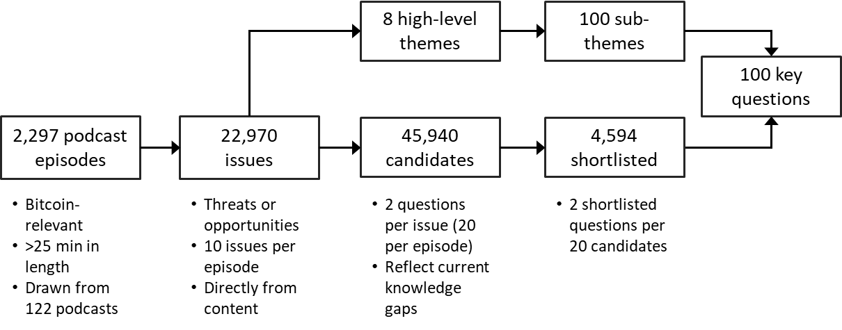 Key questions exercises are widely used to identify policy-salient research needs in fields characterized by complexity, uncertainty, and rapid change (Boxall et al., 2012; Fleishman et al., 2011; Oldekop et al., 2016; Pretty et al., 2010; Rudd et al., 2018; Sutherland et al., 2009; Sutherland et al., 2013). Traditional exercises typically solicit candidate research questions from academics, policy-makers, and practitioners, screen them for relevance and redundancy, organize them thematically, and then refine the pool through expert deliberation to produce a final list of priority questions (Sutherland et al., 2011). While this approach remains valuable, it is resource-intensive and slow relative to the pace at which Bitcoin’s technological, economic, and political context continues to evolve (Rudd, 2023c, d).