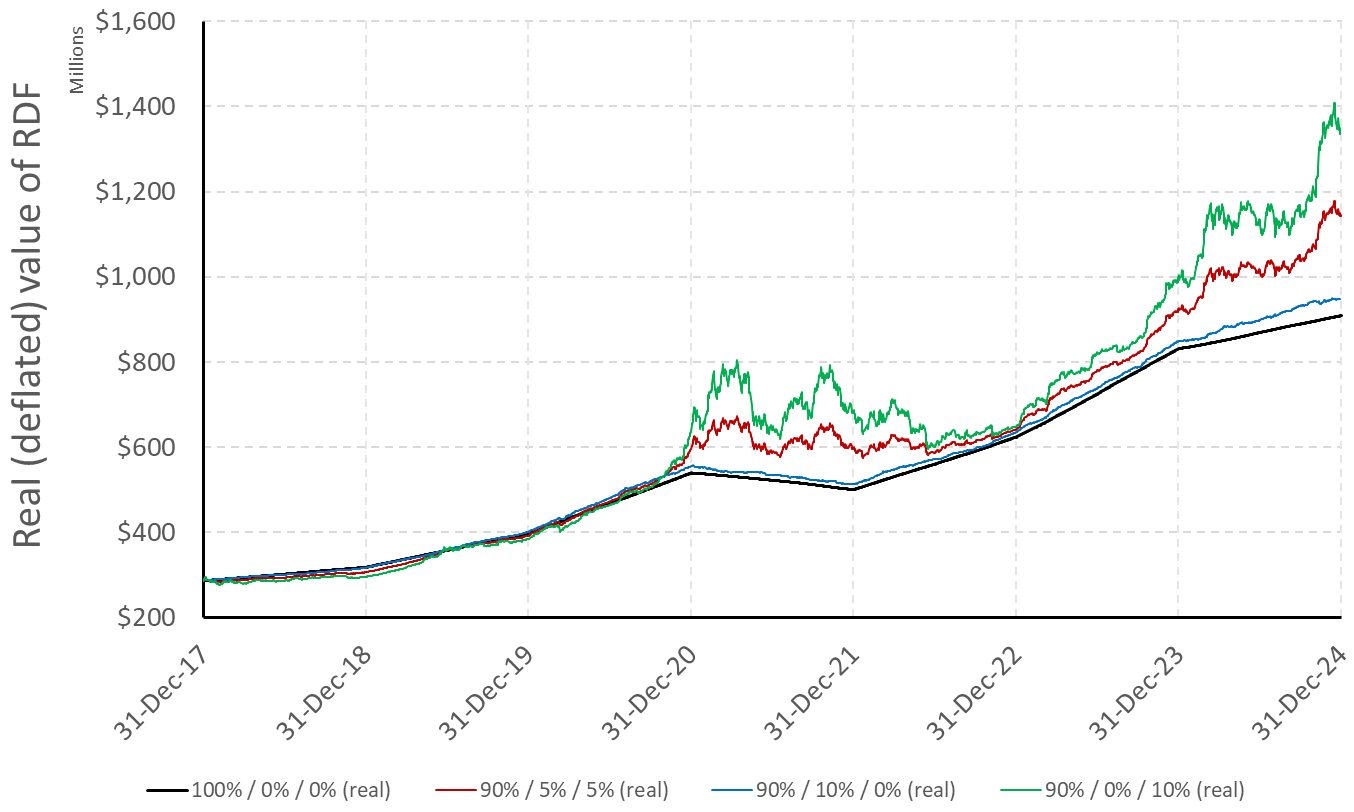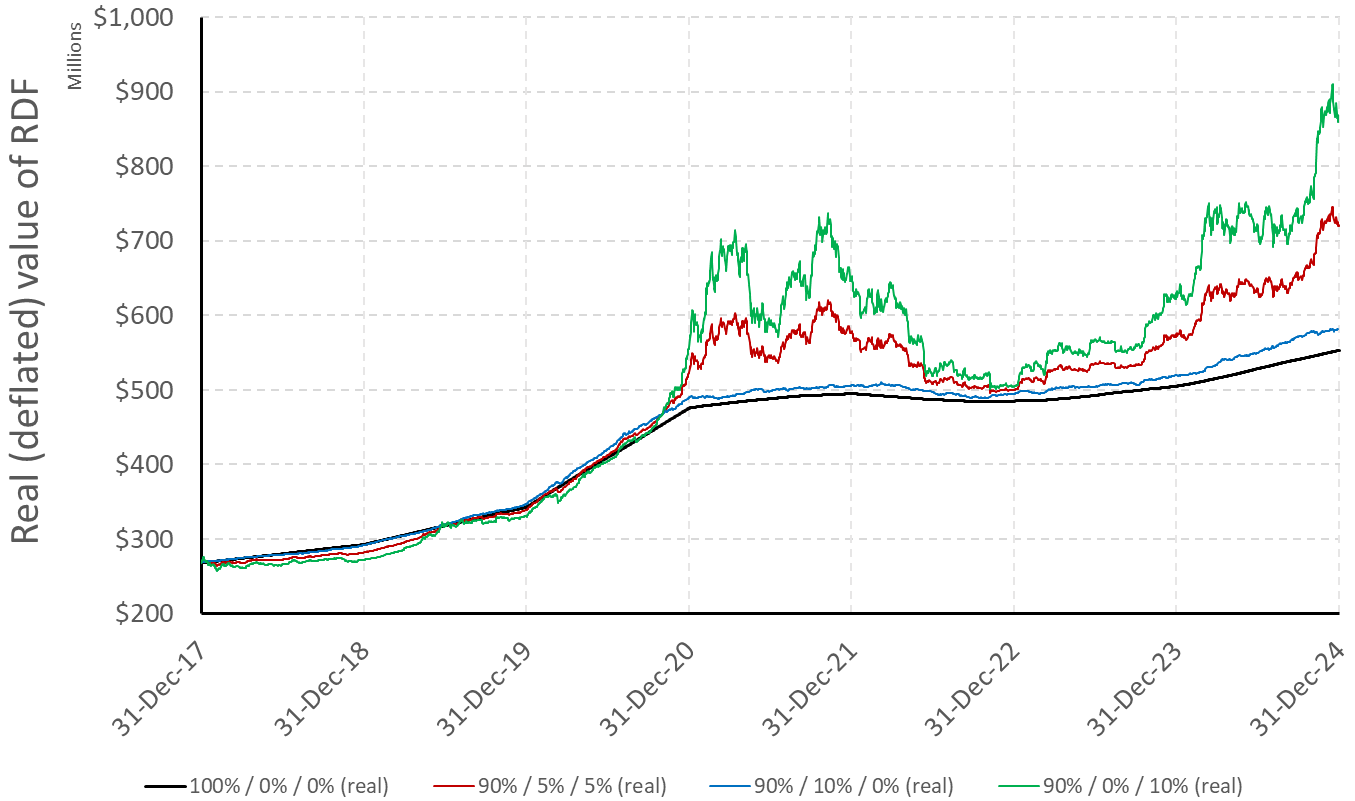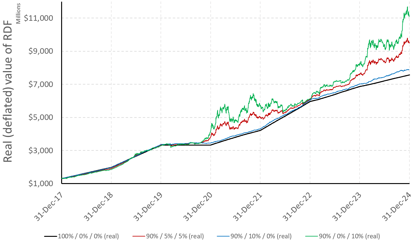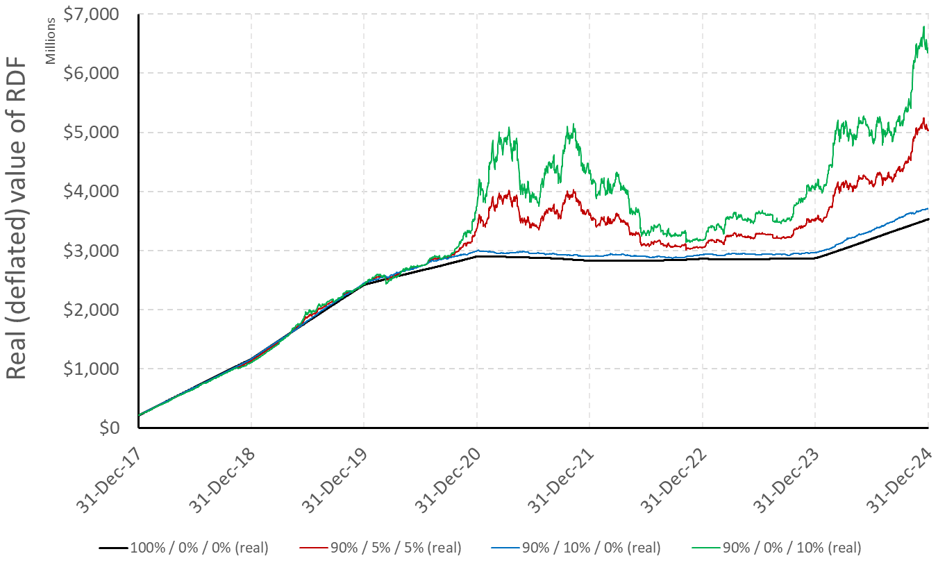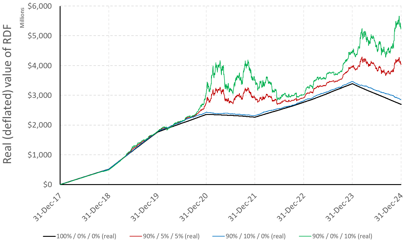 In the report I only had room to include a few charts for specific states. Below, I have posted summary charts for all 50 states. These are based on the assumption that they would have allocated to gold and/or Bitcoin in January 2018 and continued to invest or sell, depending on annual RDF flows, to the end of 2024.