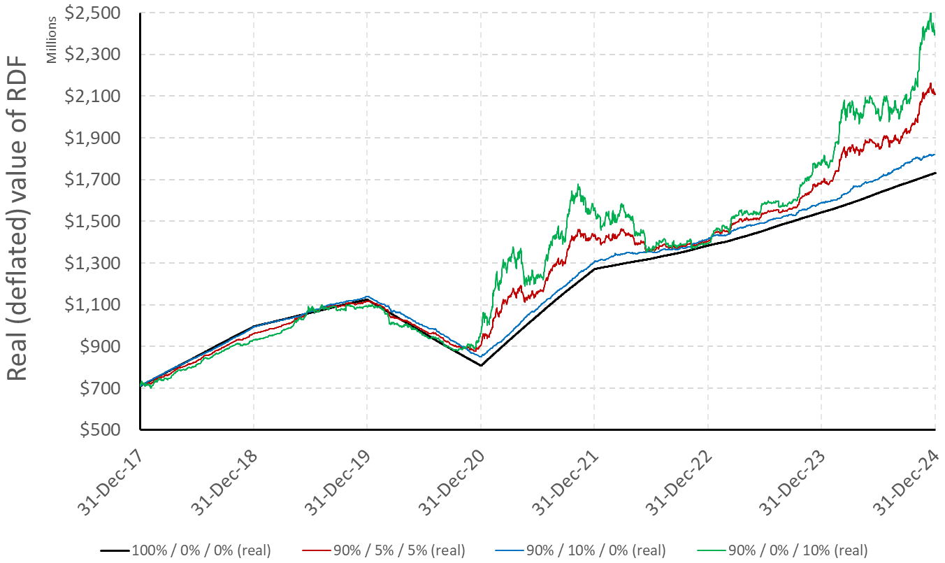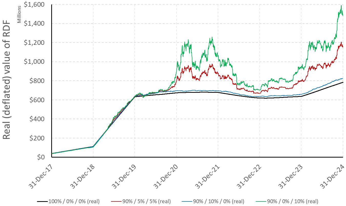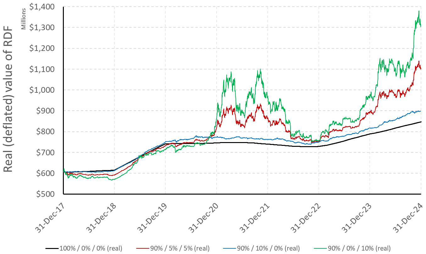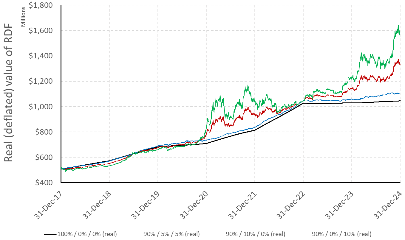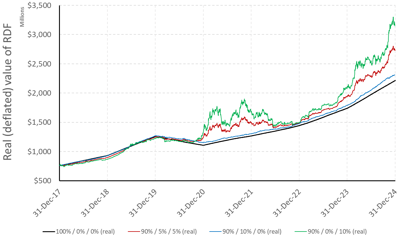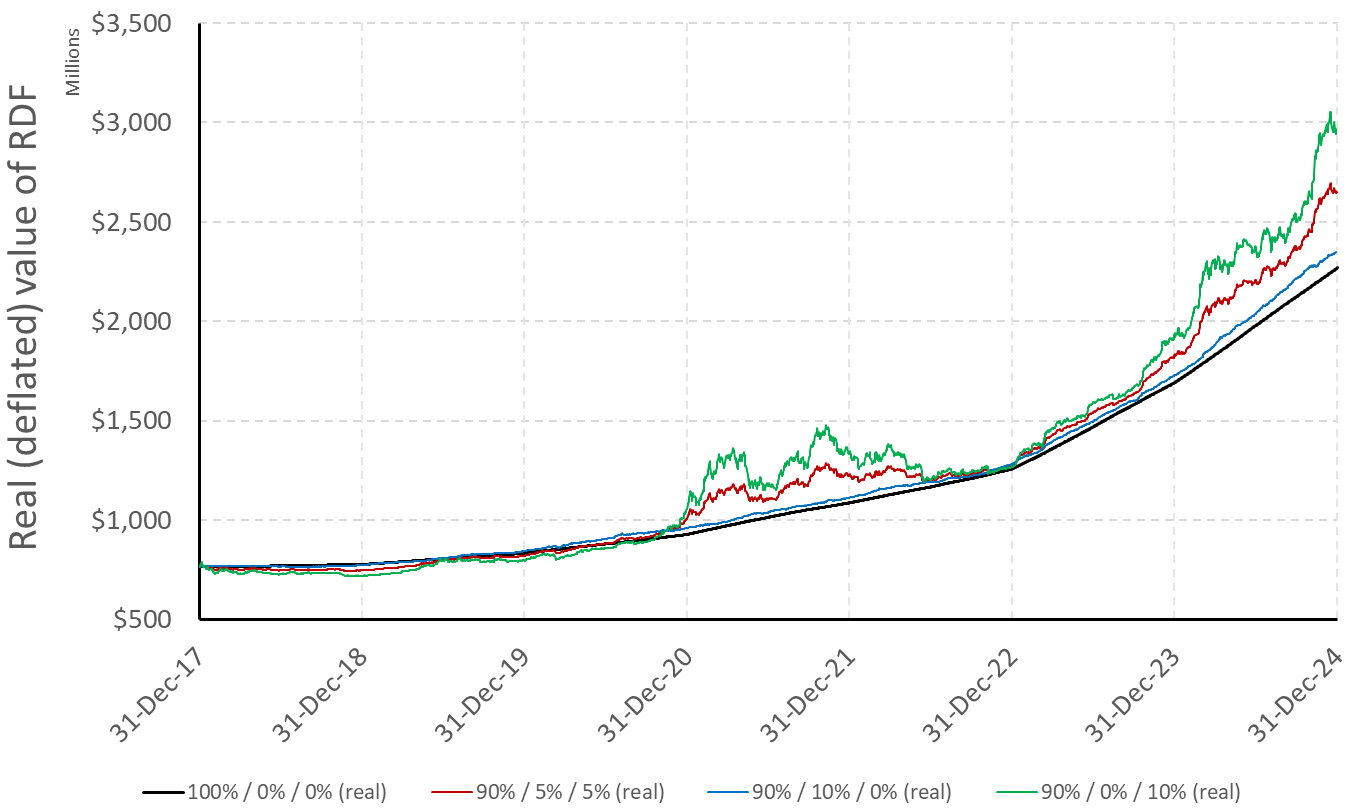 In the report I only had room to include a few charts for specific states. Below, I have posted summary charts for all 50 states. These are based on the assumption that they would have allocated to gold and/or Bitcoin in January 2018 and continued to invest or sell, depending on annual RDF flows, to the end of 2024.