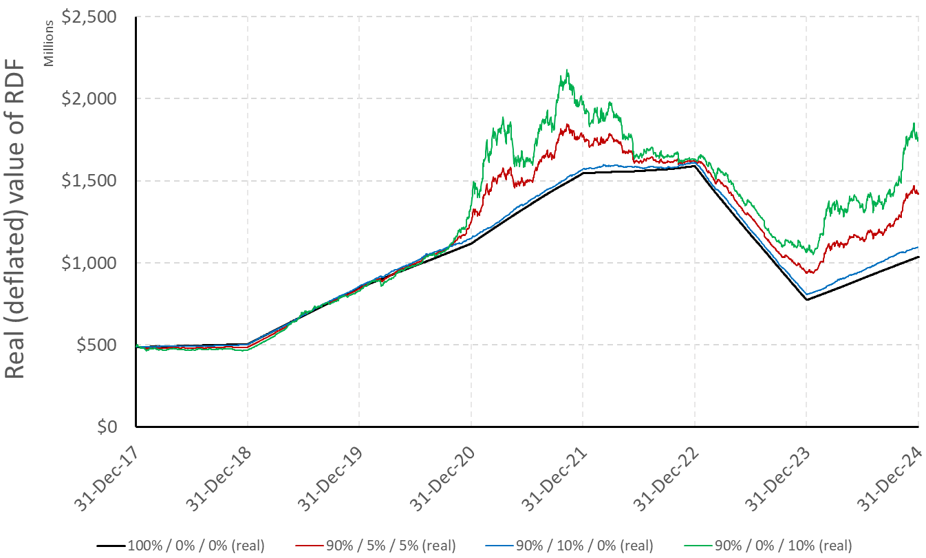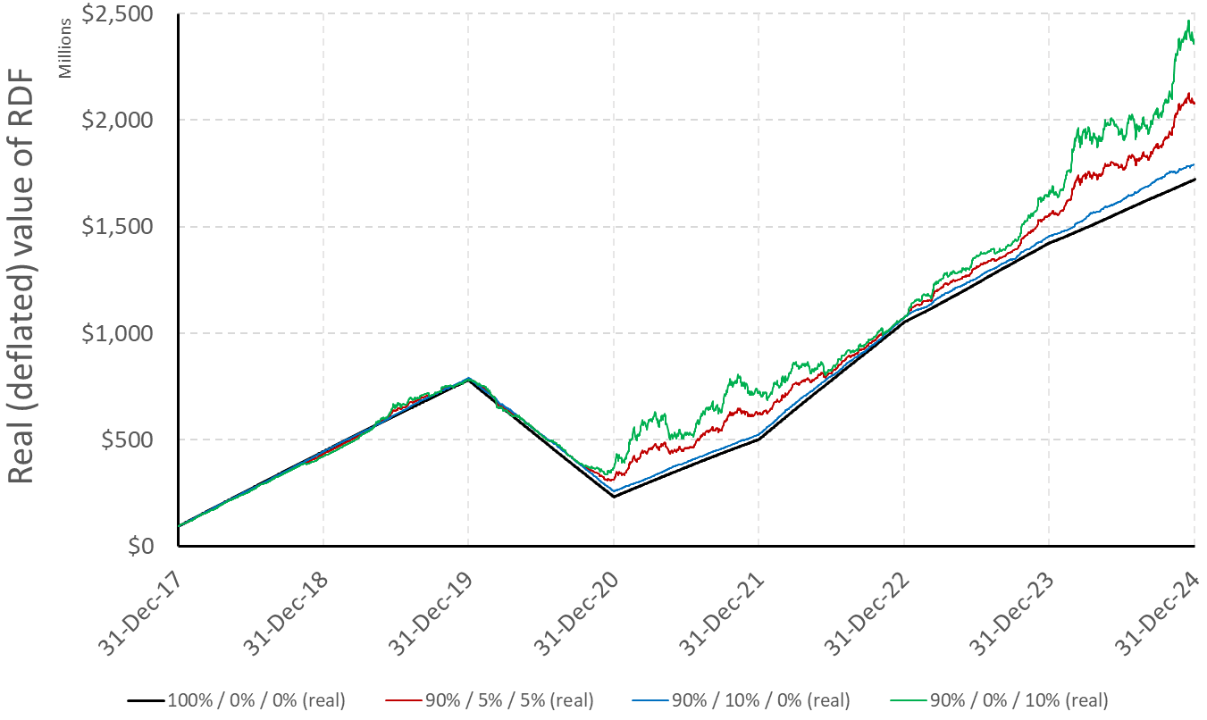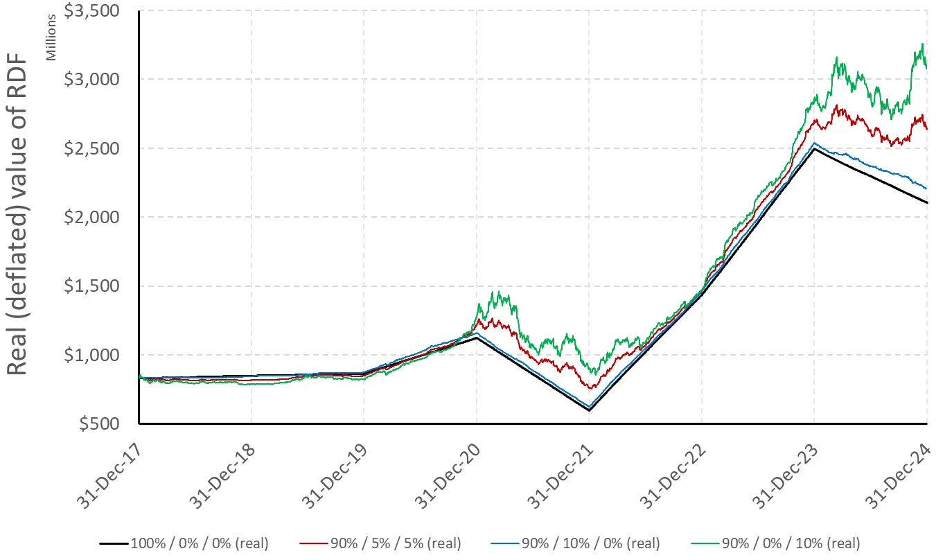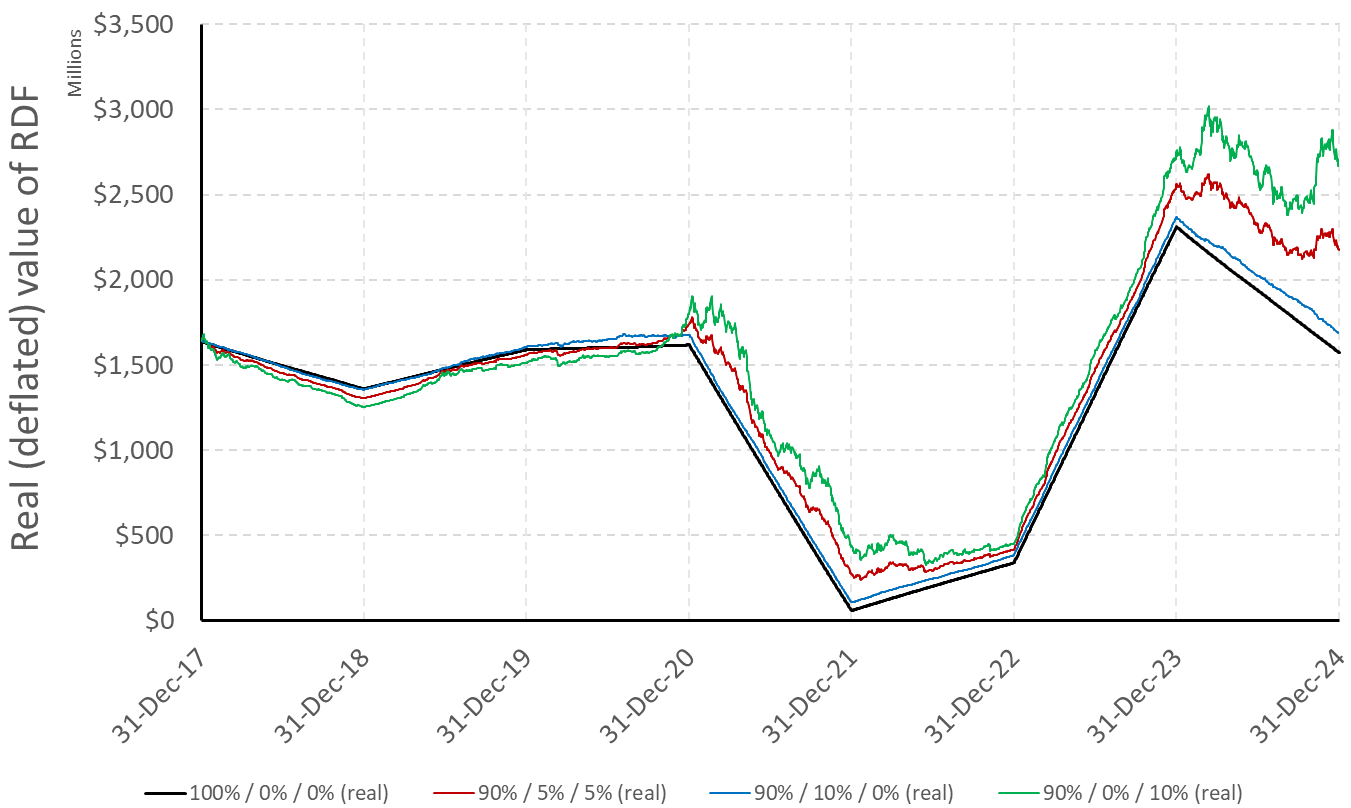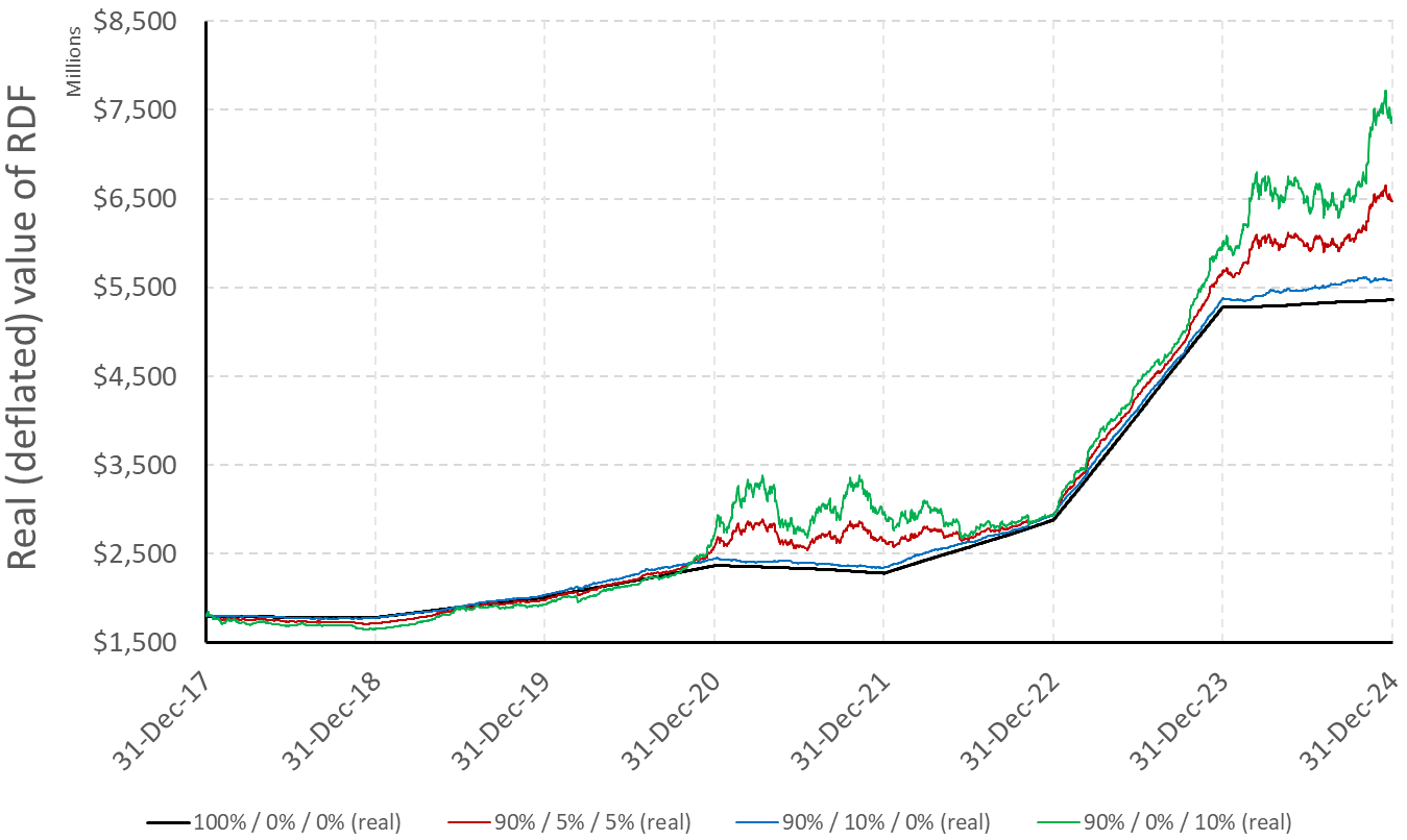 In the report I only had room to include a few charts for specific states. Below, I have posted summary charts for all 50 states. These are based on the assumption that they would have allocated to gold and/or Bitcoin in January 2018 and continued to invest or sell, depending on annual RDF flows, to the end of 2024.
