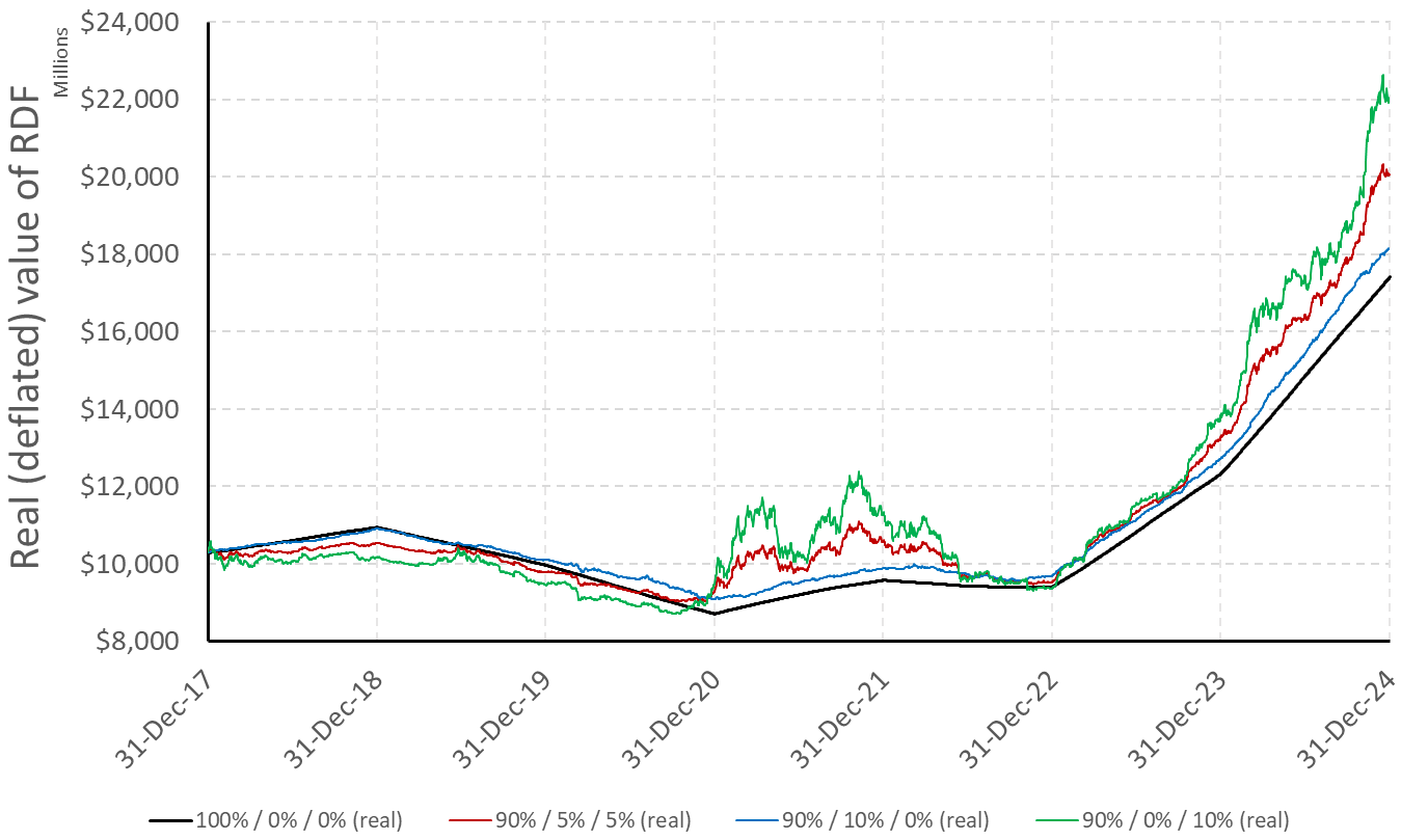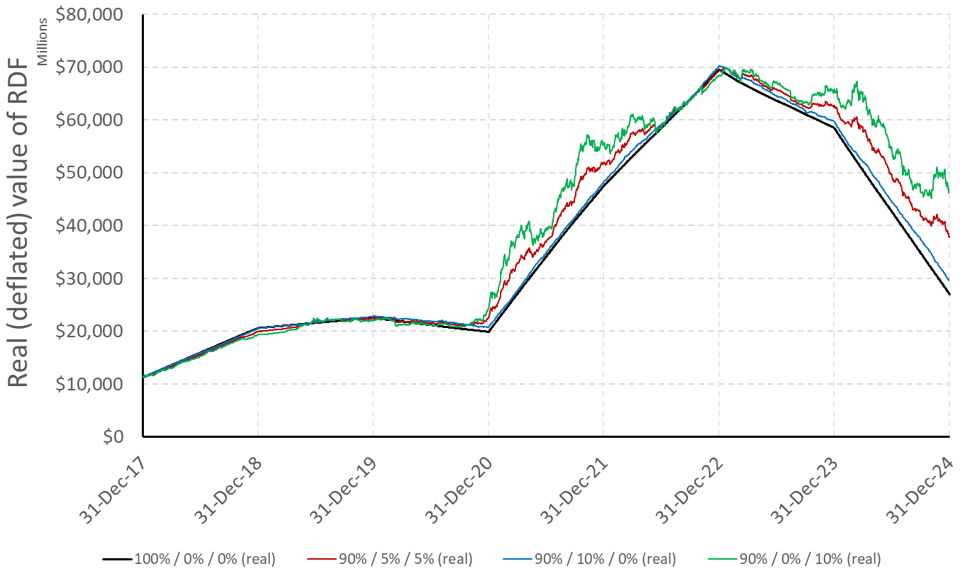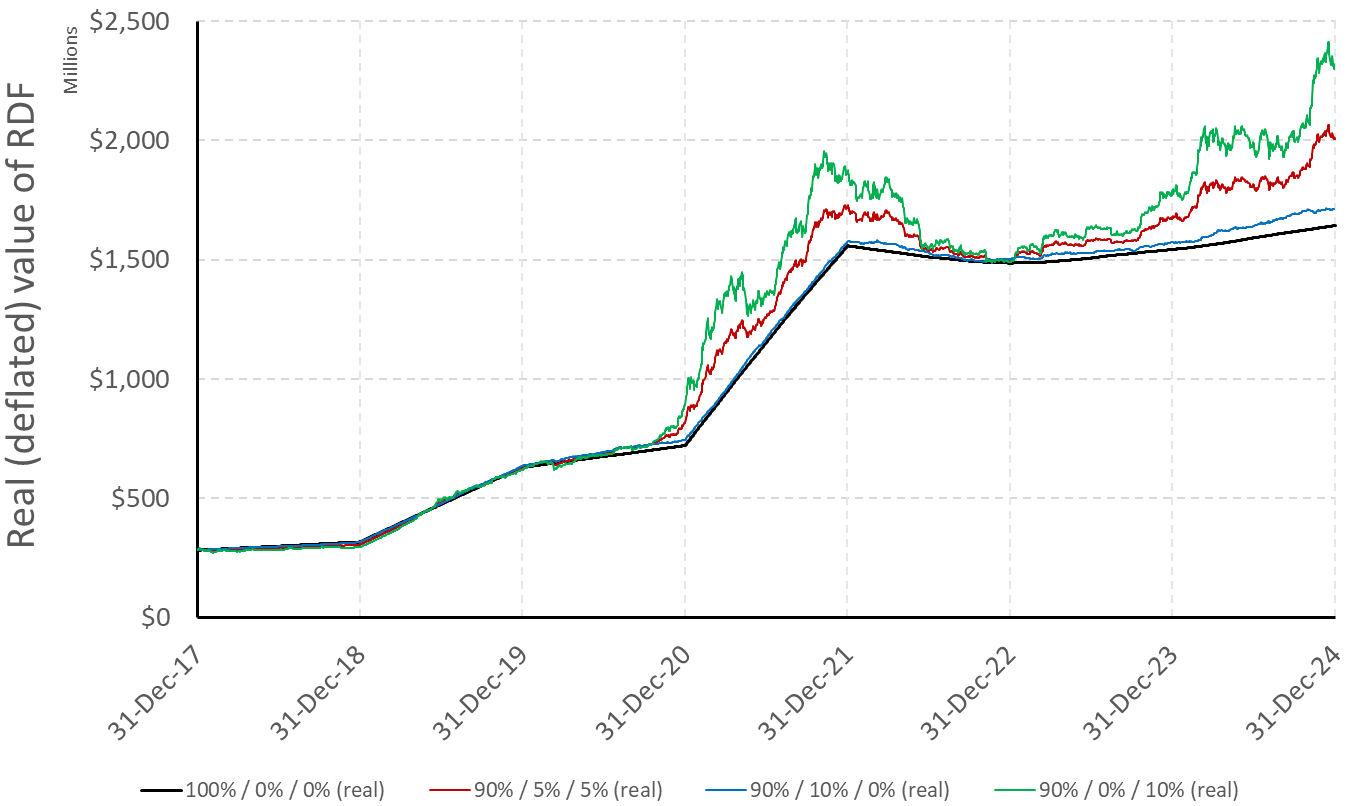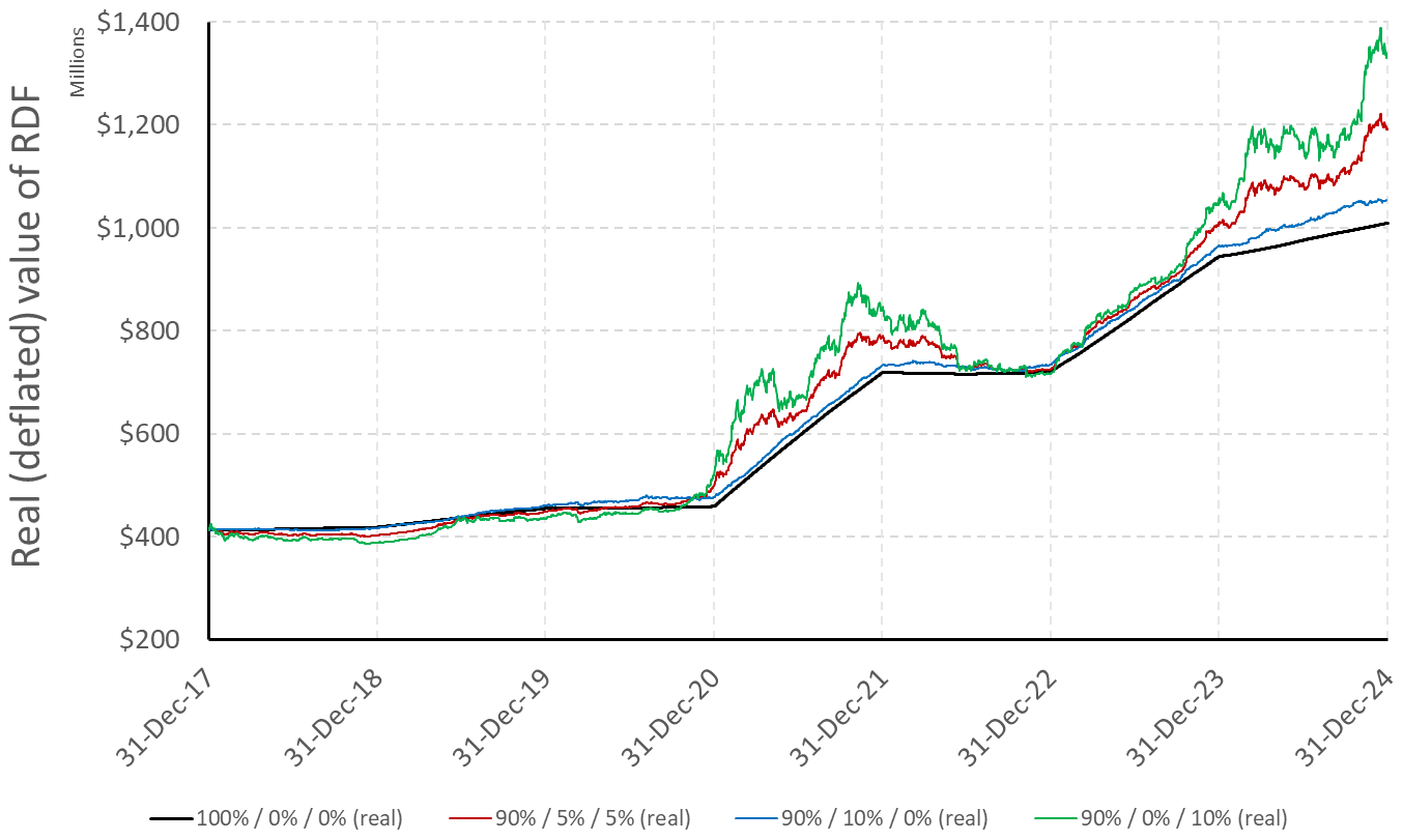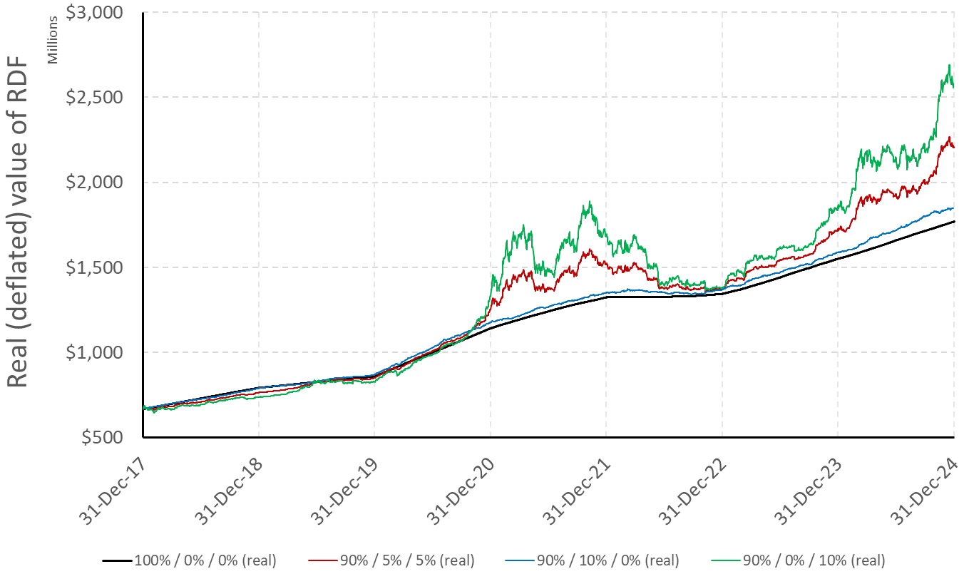In the report I only had room to include a few charts for specific states. Below, I have posted summary charts for all 50 states. These are based on the assumption that they would have allocated to gold and/or Bitcoin in January 2018 and continued to invest or sell, depending on annual RDF flows, to the end of 2024.