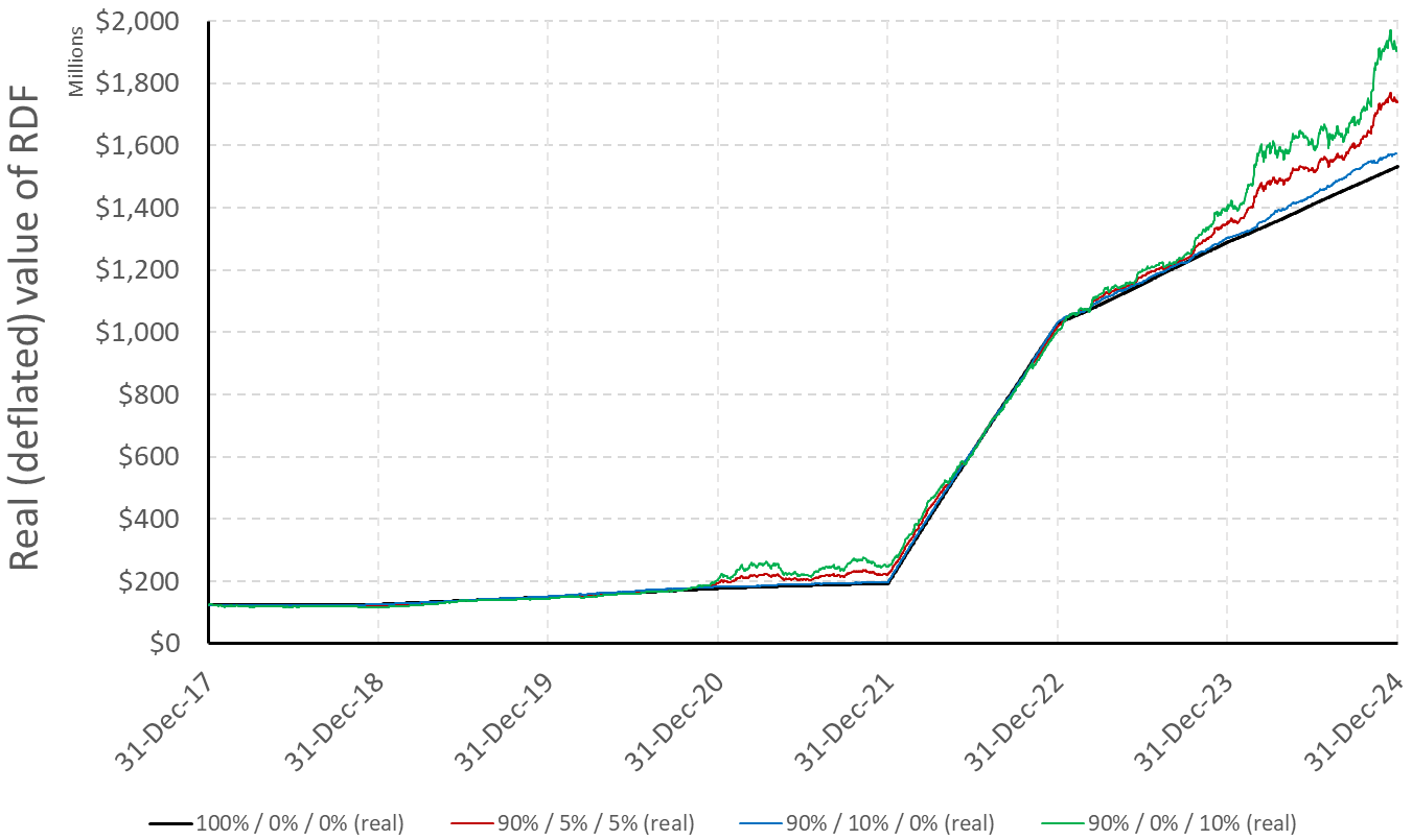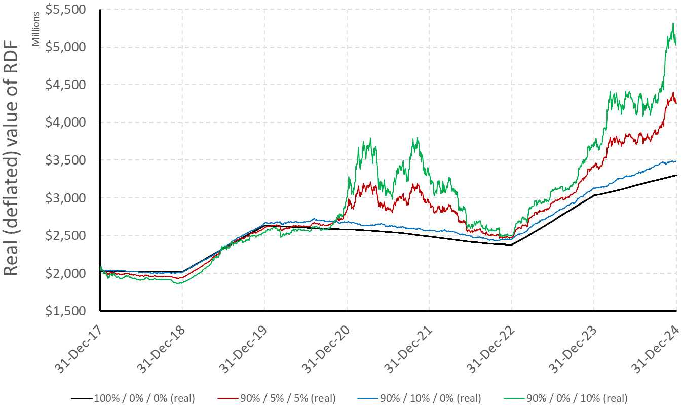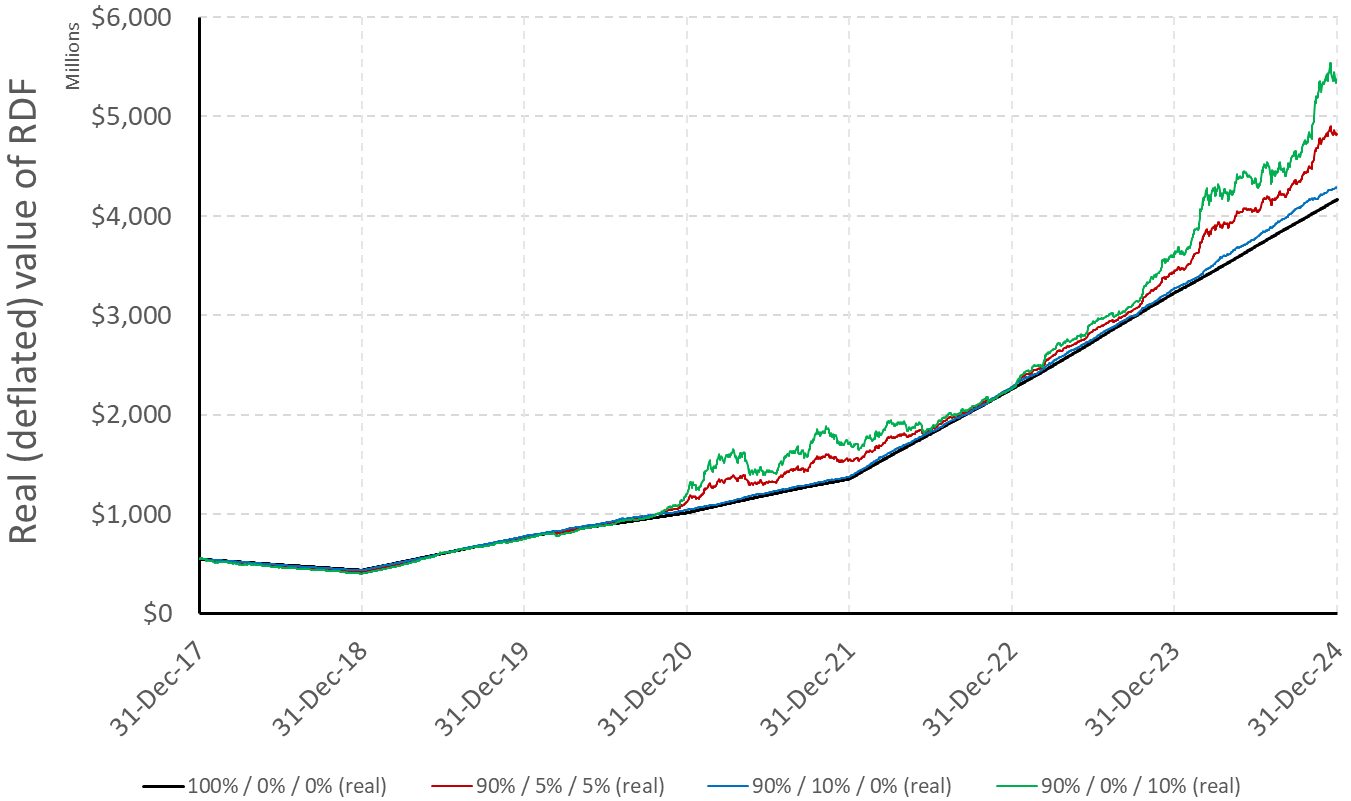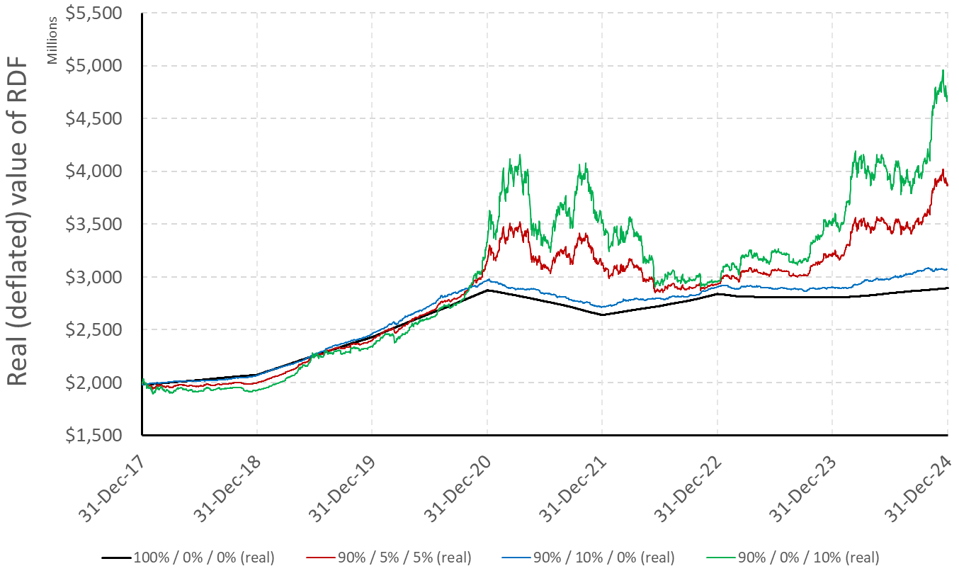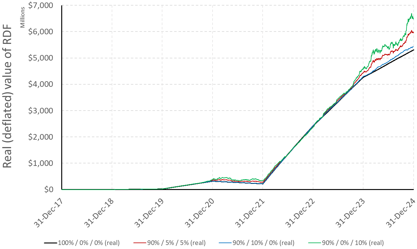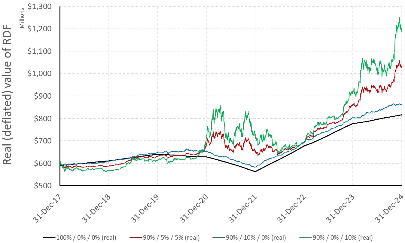 In the report I only had room to include a few charts for specific states. Below, I have posted summary charts for all 50 states. These are based on the assumption that they would have allocated to gold and/or Bitcoin in January 2018 and continued to invest or sell, depending on annual RDF flows, to the end of 2024.