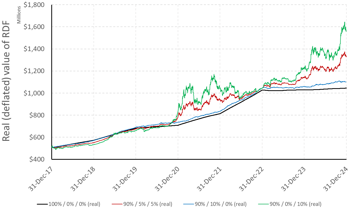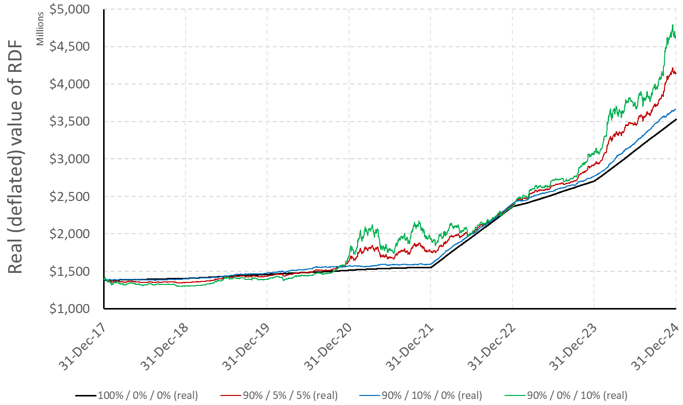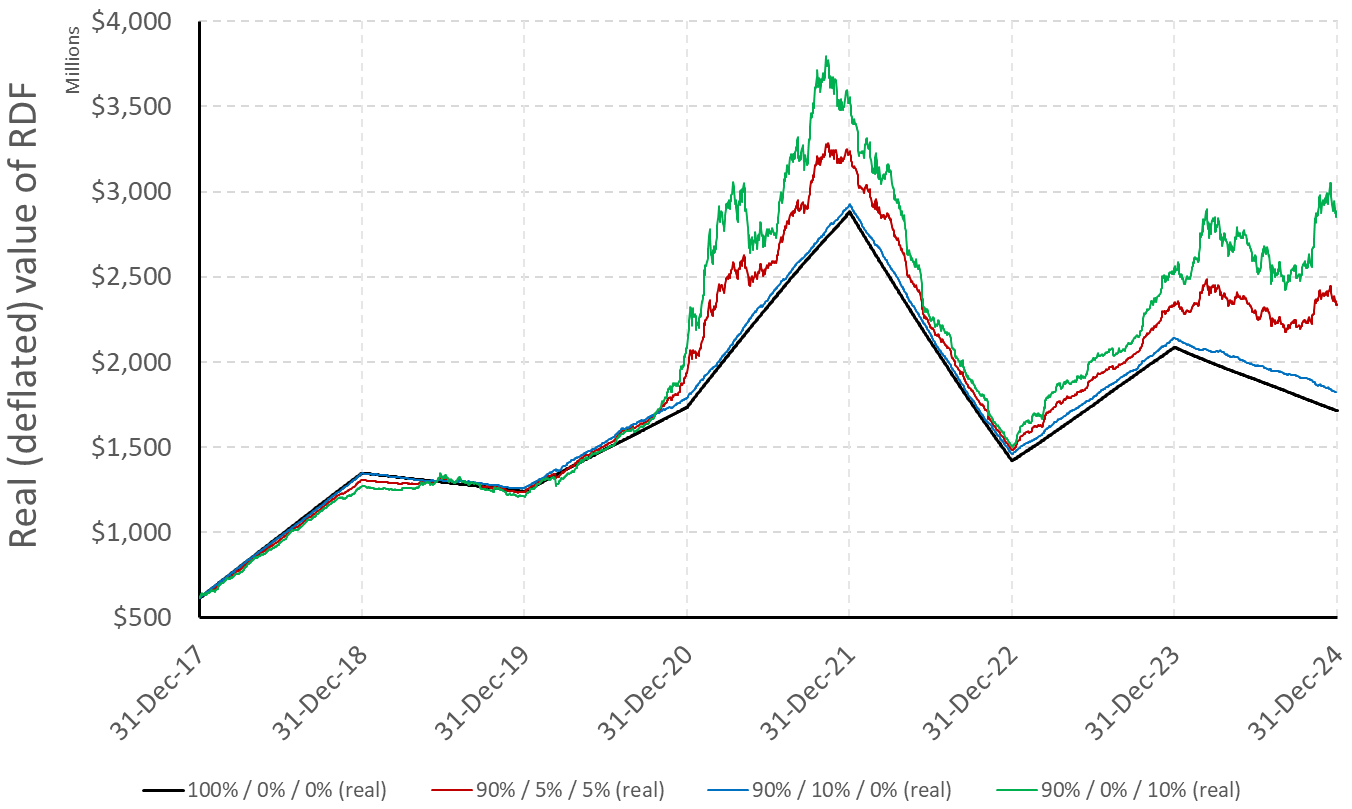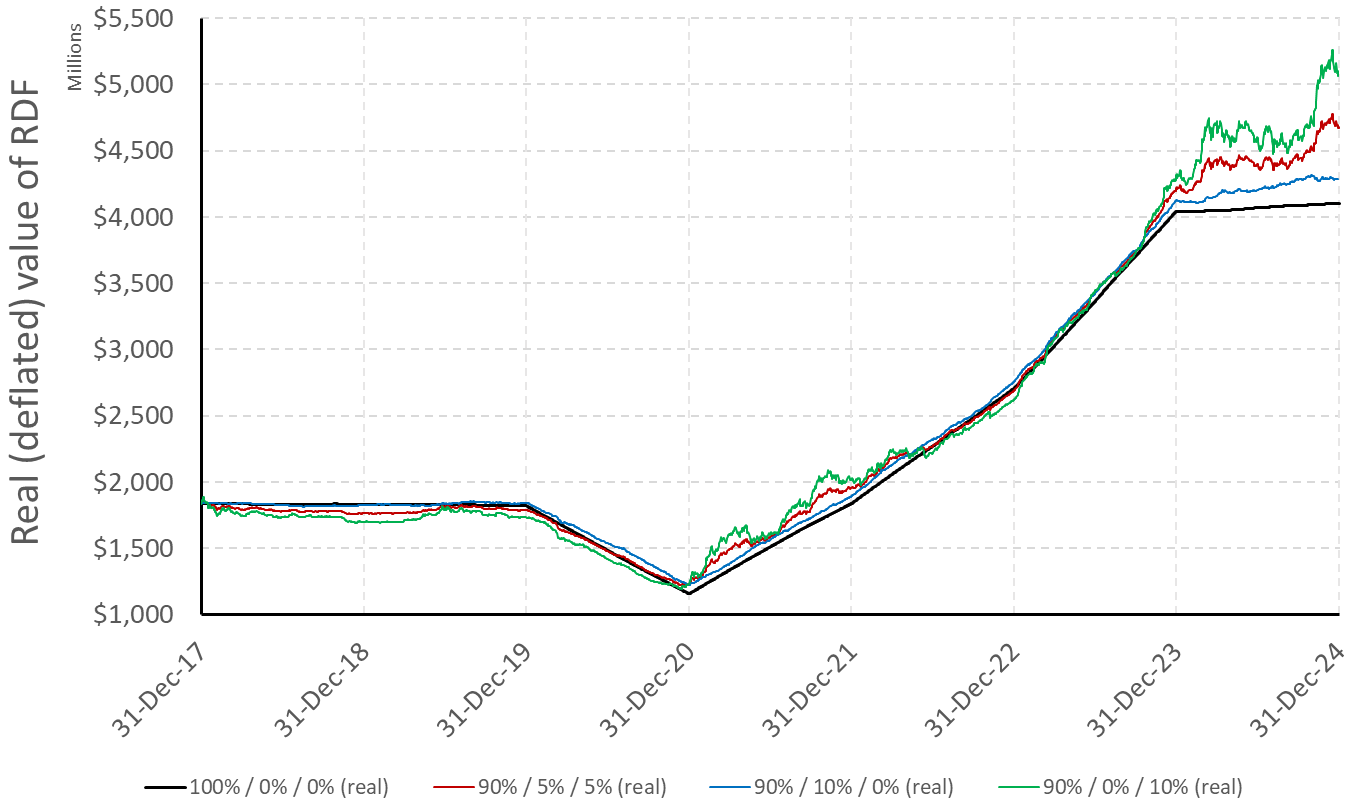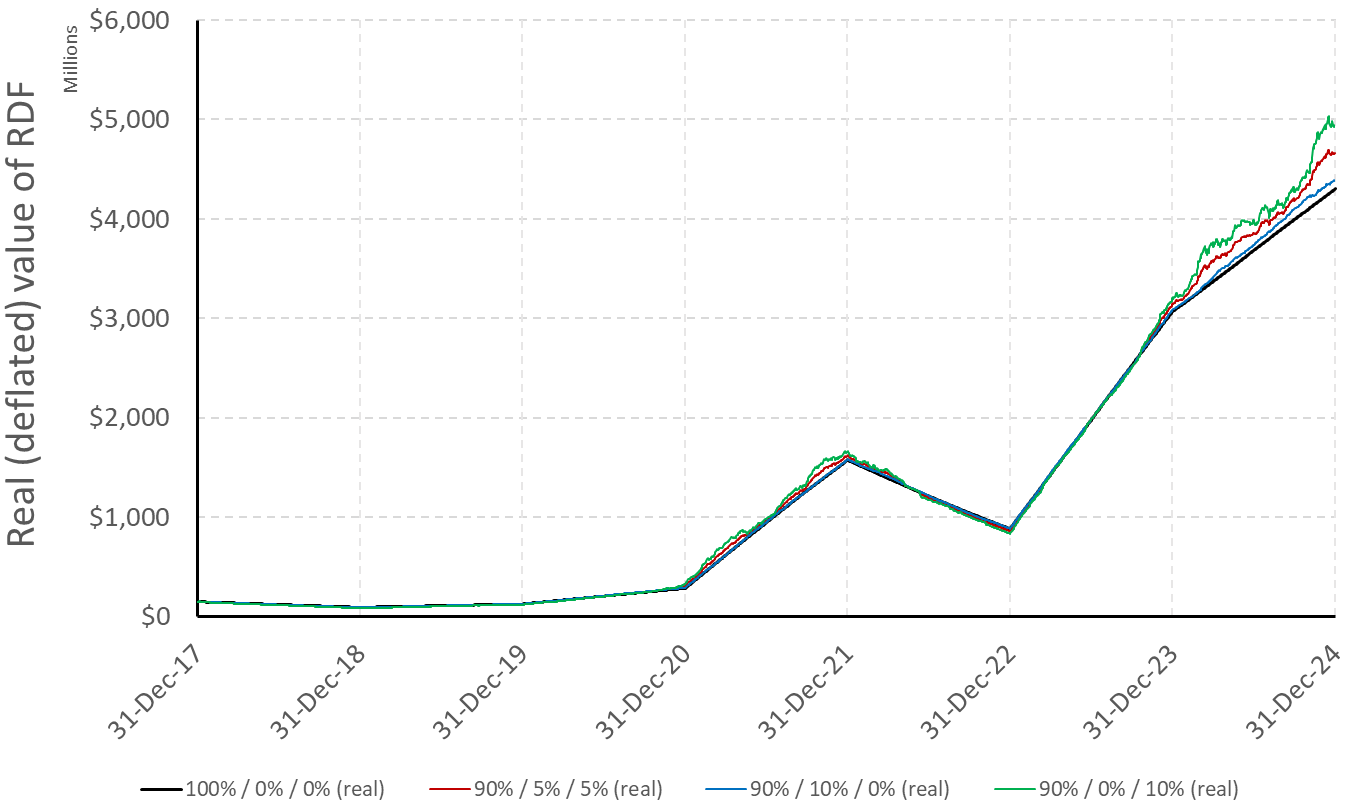 In the report I only had room to include a few charts for specific states. Below, I have posted summary charts for all 50 states. These are based on the assumption that they would have allocated to gold and/or Bitcoin in January 2018 and continued to invest or sell, depending on annual RDF flows, to the end of 2024.