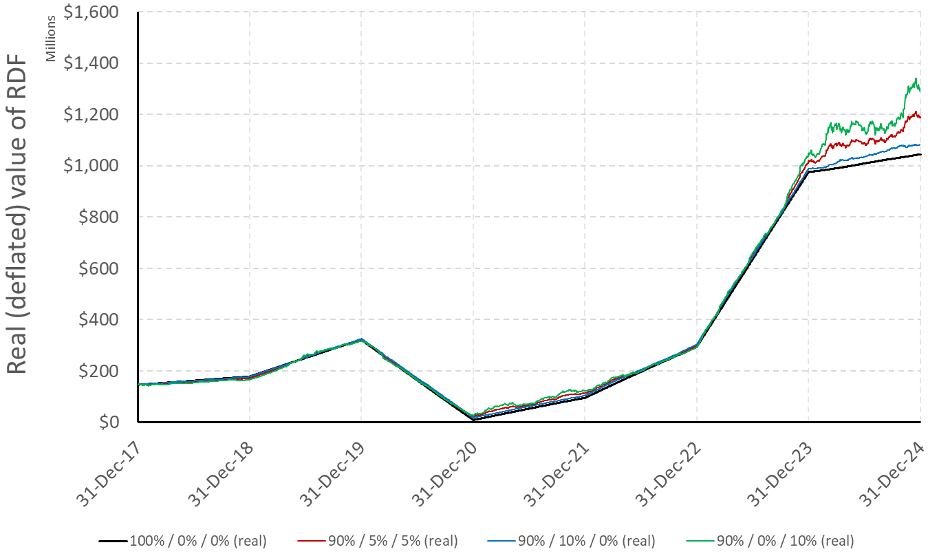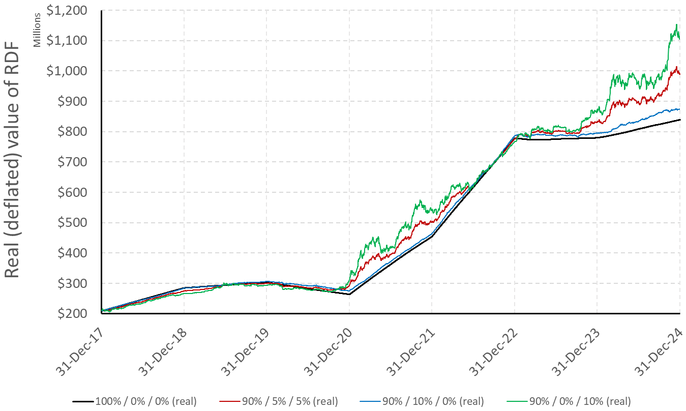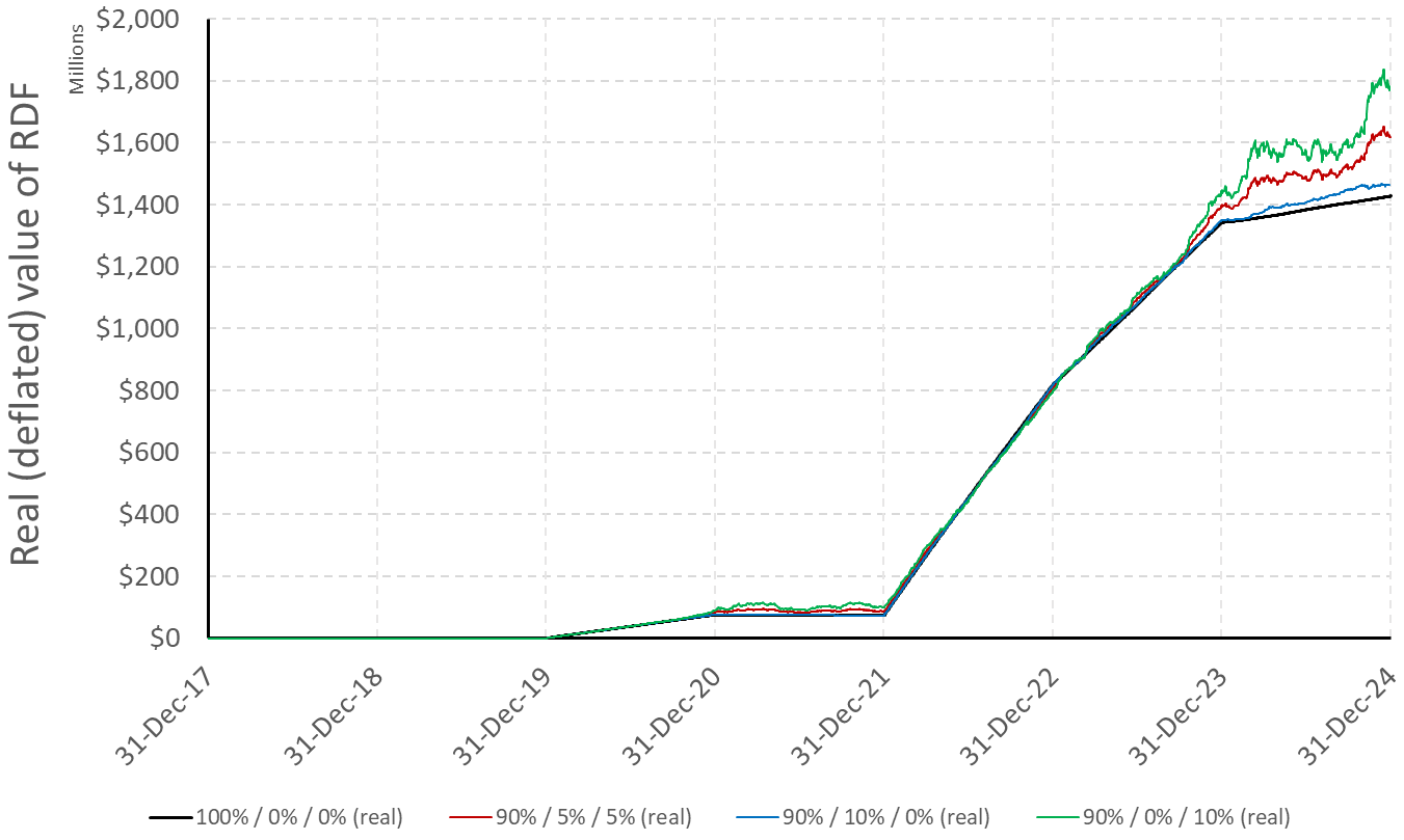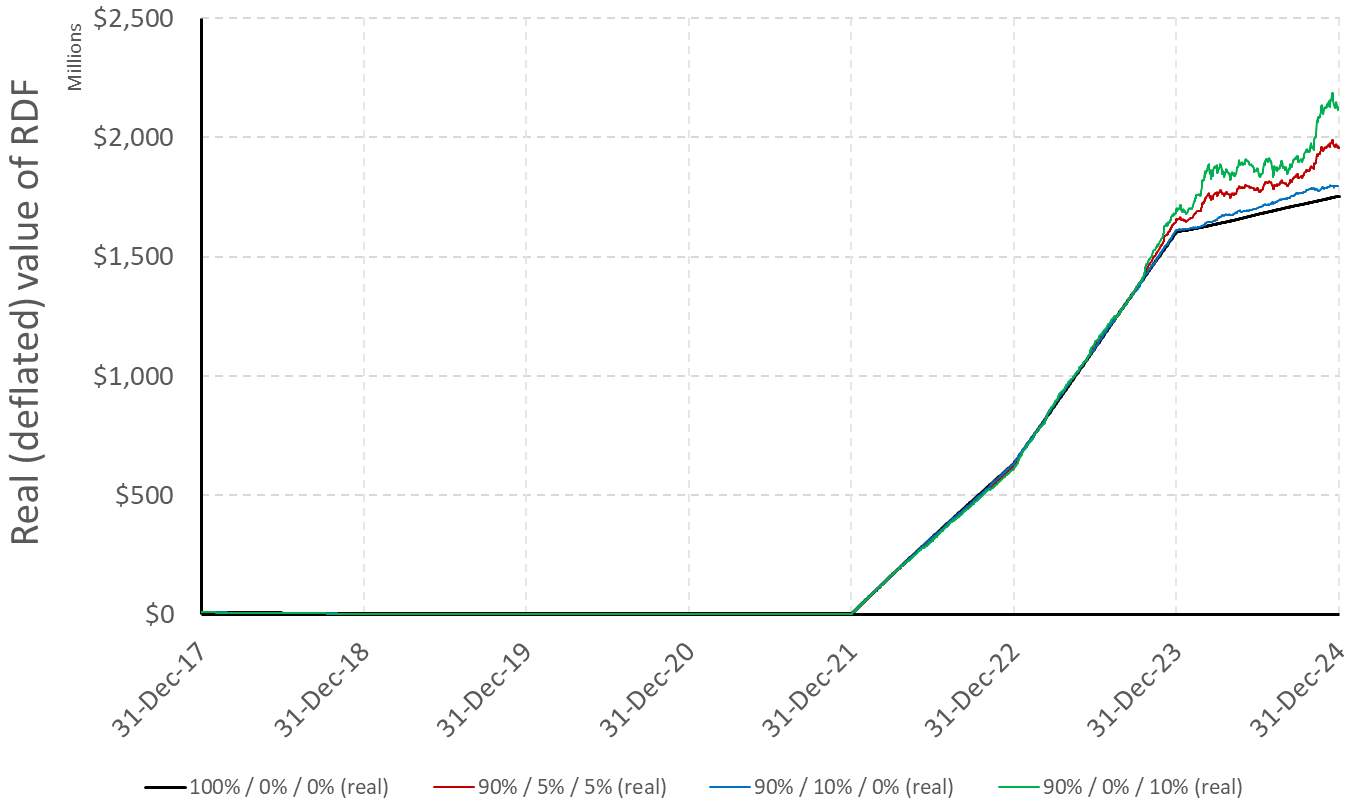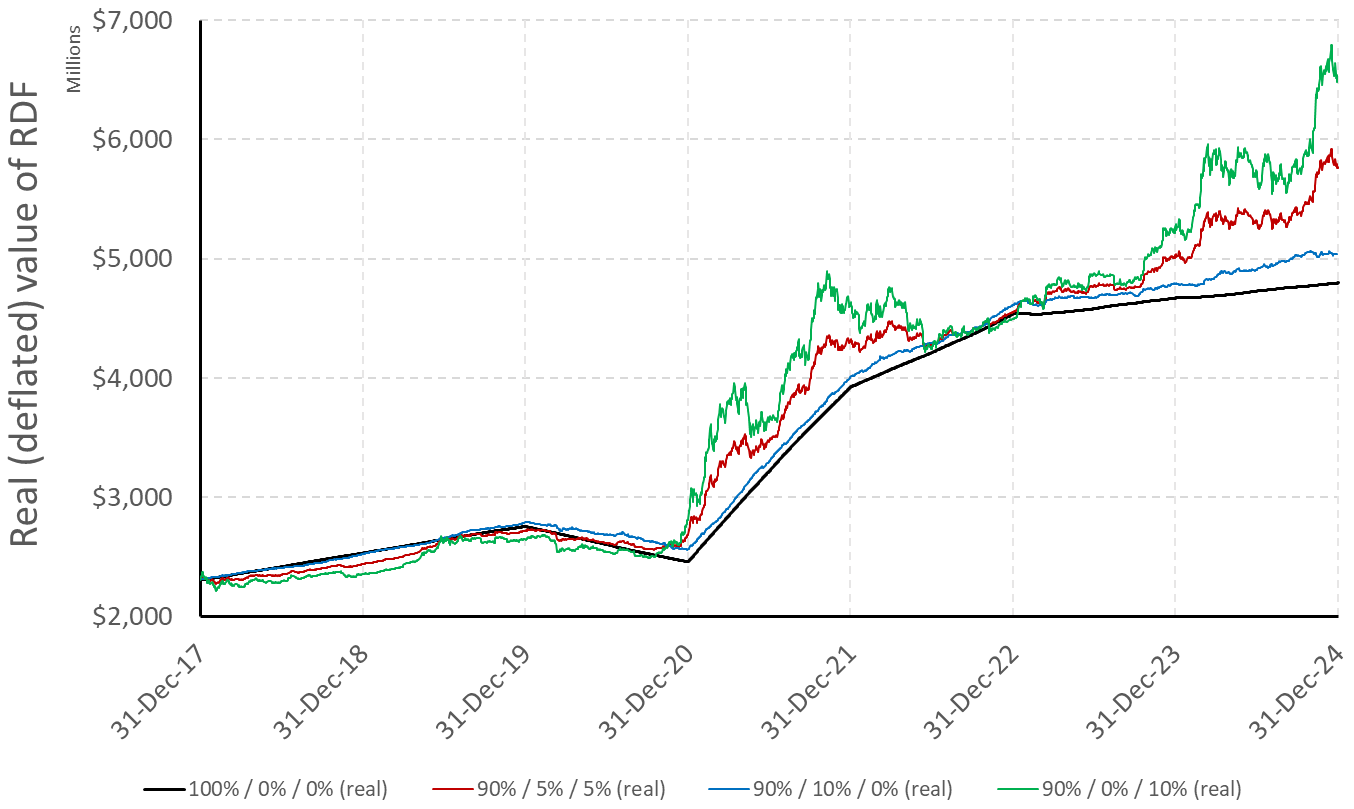 In the report I only had room to include a few charts for specific states. Below, I have posted summary charts for all 50 states. These are based on the assumption that they would have allocated to gold and/or Bitcoin in January 2018 and continued to invest or sell, depending on annual RDF flows, to the end of 2024.