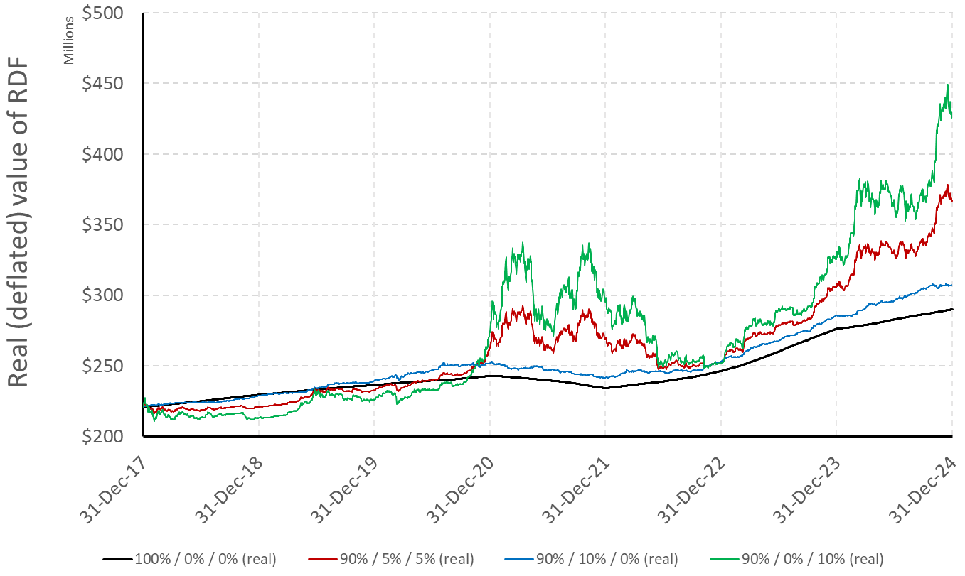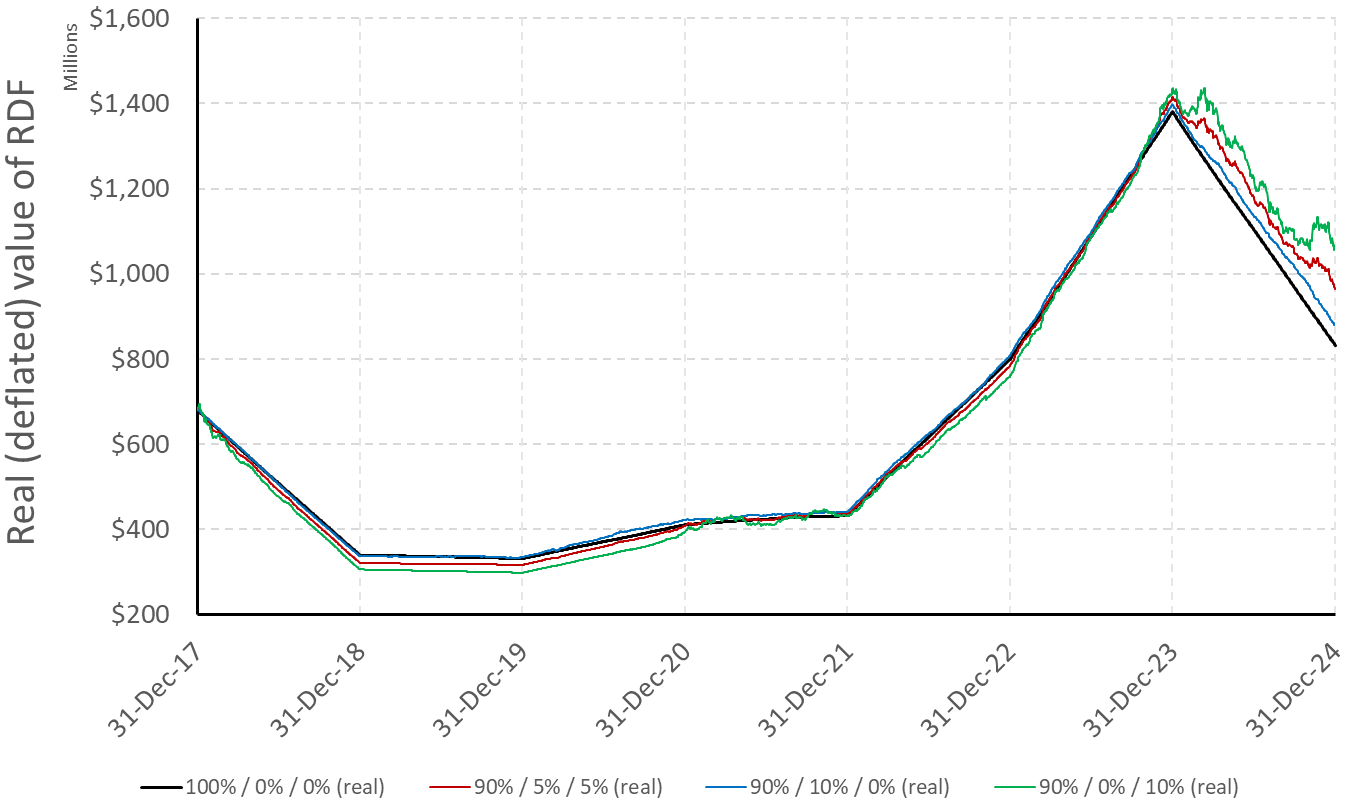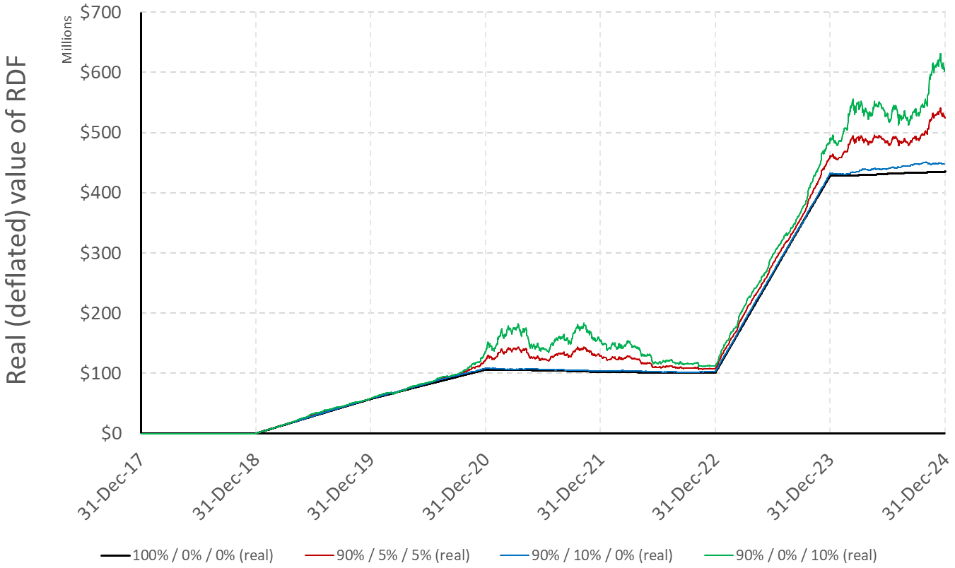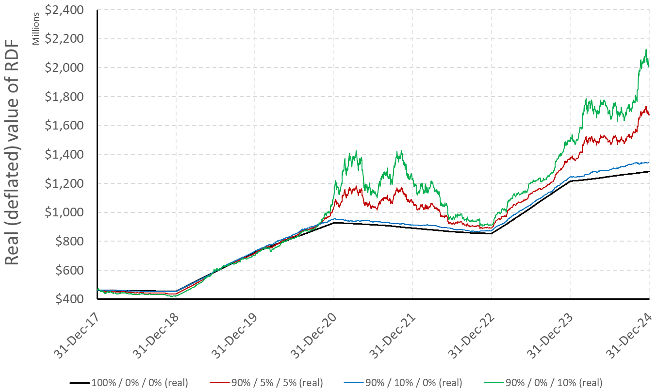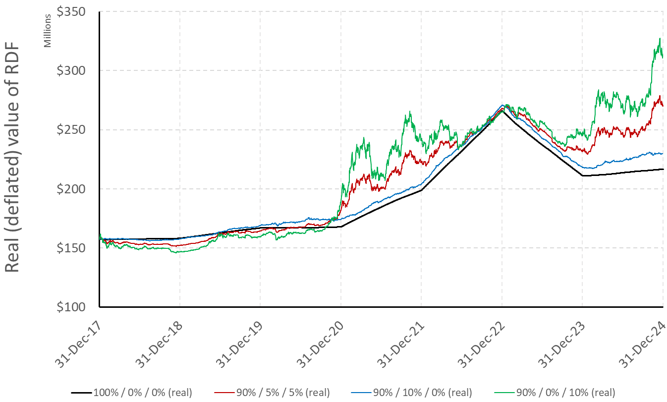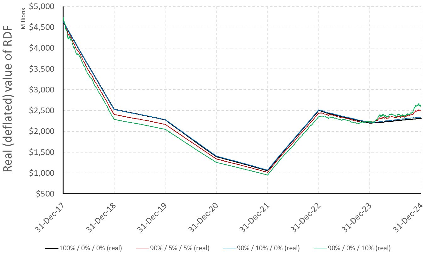 In the report I only had room to include a few charts for specific states. Below, I have posted summary charts for all 50 states. These are based on the assumption that they would have allocated to gold and/or Bitcoin in January 2018 and continued to invest or sell, depending on annual RDF flows, to the end of 2024.