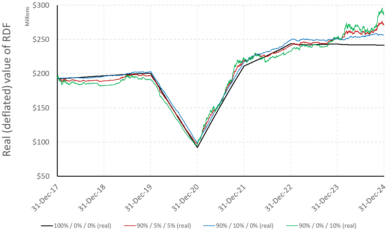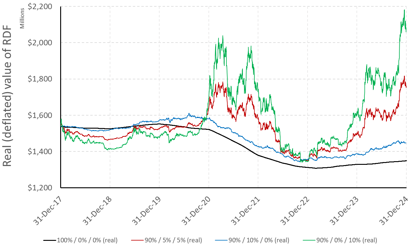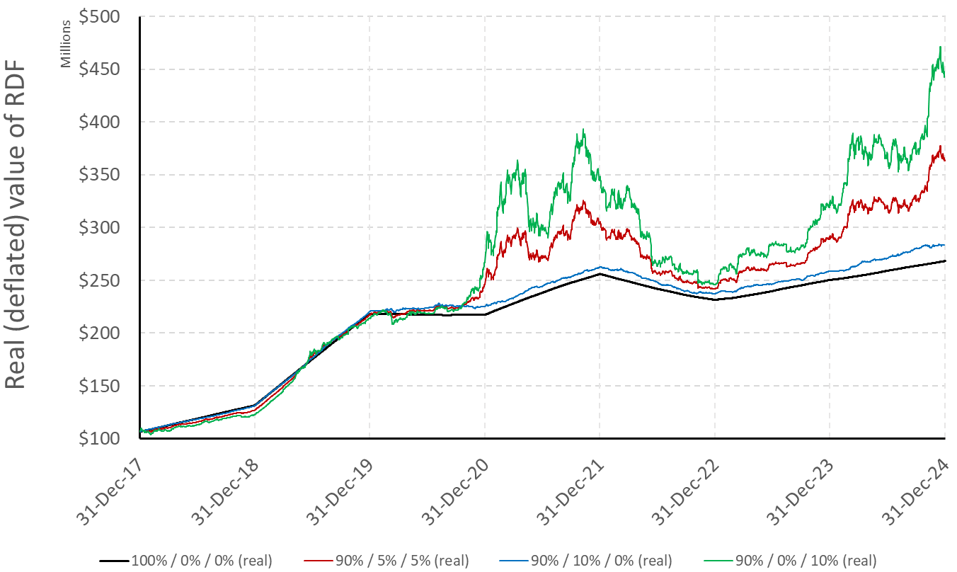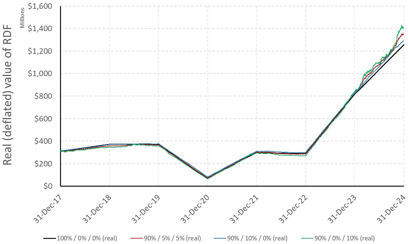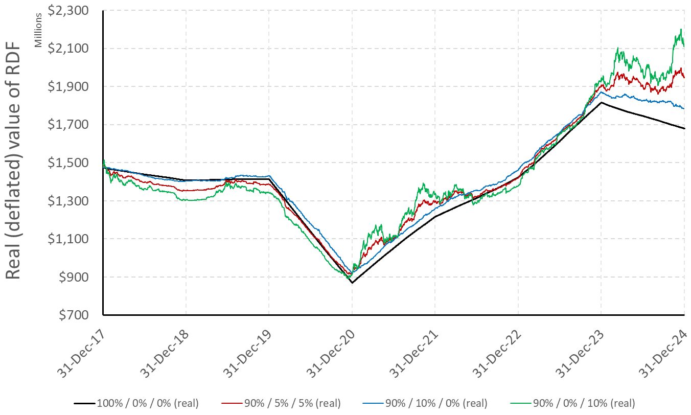 In the report I only had room to include a few charts for specific states. Below, I have posted summary charts for all 50 states. These are based on the assumption that they would have allocated to gold and/or Bitcoin in January 2018 and continued to invest or sell, depending on annual RDF flows, to the end of 2024.