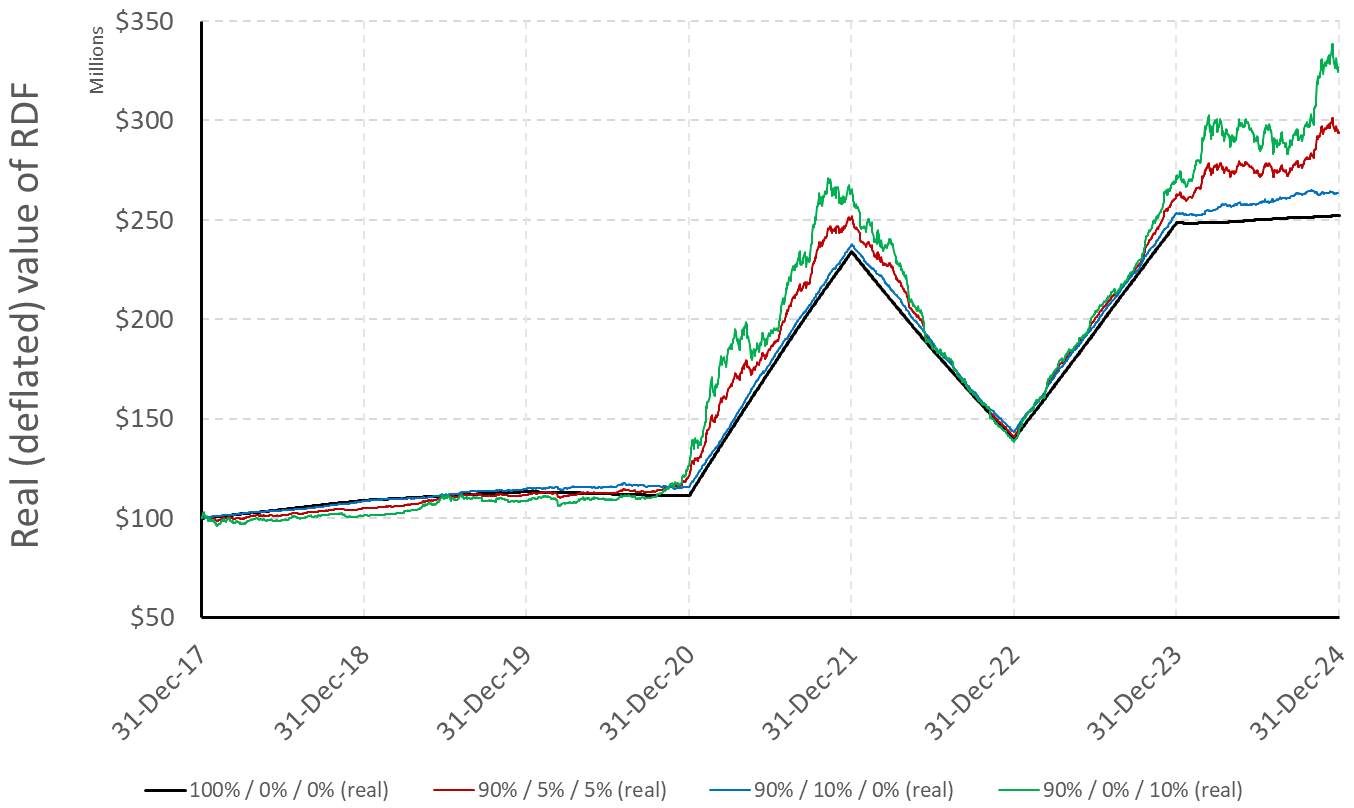 Each chart shows four combinations of investments (for clarity I didn't try to squeeze all combos in):